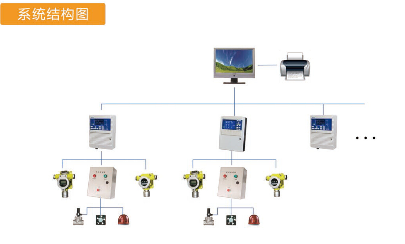 控制器通过查询的方式获取探测器的信息,经高速CPU数据处理,通过LCD显示出现场探测器的浓度、状态,当探测器浓度超限时,控制器会发出声光报警同时输出控制器联动外接设备。