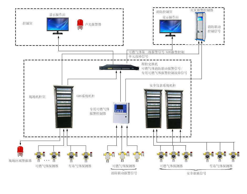 GDS气体报警监控系统是一套对可燃、有毒气体探测与控制的安全管理控制系统。通过安装于现场危险区的气体探测器探测现场险情,当发生气体泄漏时,通过中央控制室的控制器发出有针对性的报警信号,提醒操作人员采取相应措施,自动触发现场区域声光报警器,向装置区巡检人员发出报警。可燃气体二级报警信号、可燃气体和有毒气体检测报警系统报警控制单元的故障信号应送至消防控制室。