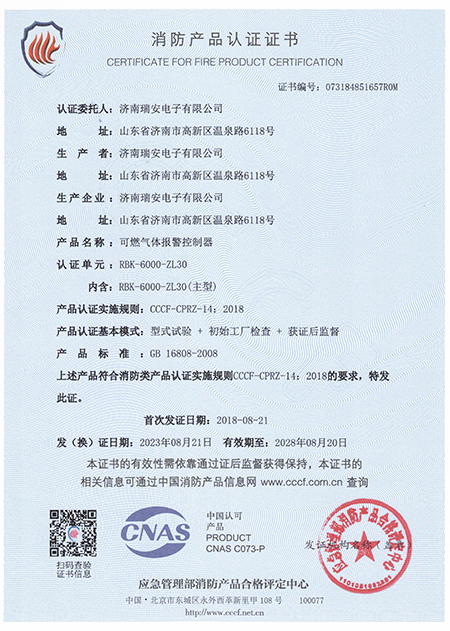 RBK-6000-ZL30气体报警控制器消防产品认证证书