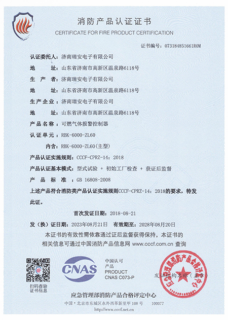 RBK-6000-ZL60气体报警控制器消防产品认证证书